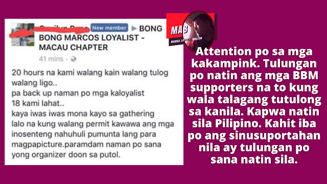 Sa totoo lang ay may sama ng loob ang ibang kakampink sa Macao dahil isinuplong umano ng ibang BBM Loyalist ang isang kahanay ng kakampink sa mga otoridad upang maipa-deport.